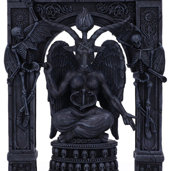 This mystical figurine is cast in the highest quality resin before being carefully hand-painted. Resting on a pillar made up of bones and skulls, the Baphomet can be seen sitting cross-legged with their arm raised in a magical blessing with the world SOLVE written on their forearm, while their left arm is stretched downwards and outwards invitingly, bearing the word COACULA.