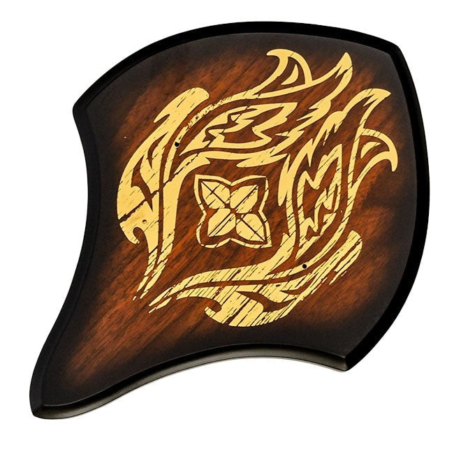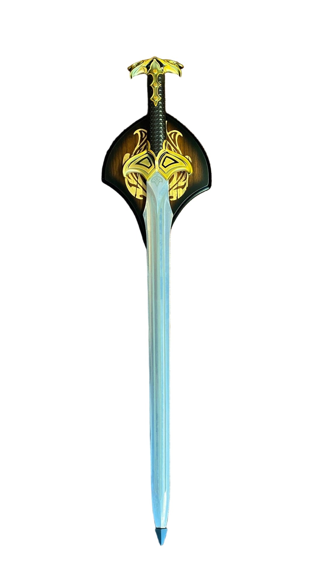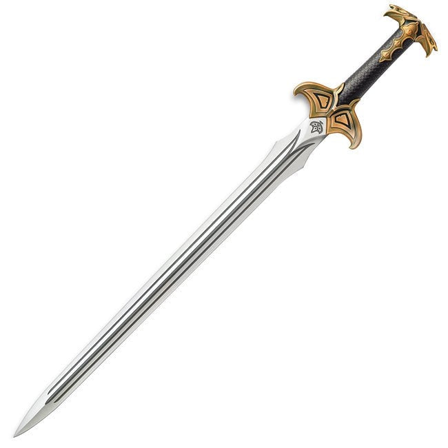The Sword of Bard the Bowman features a hilt bearing design motifs of ancient Dale, with a pommel in the shape of twin bird heads and a leather-wrapped grip embossed with an overlapping scaled feather pattern. The blade is adorned with engraved grooves and a rune etching.