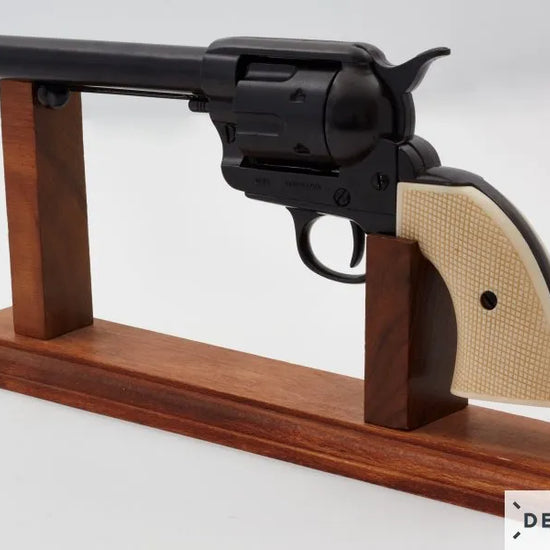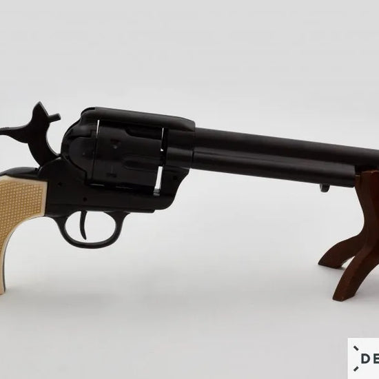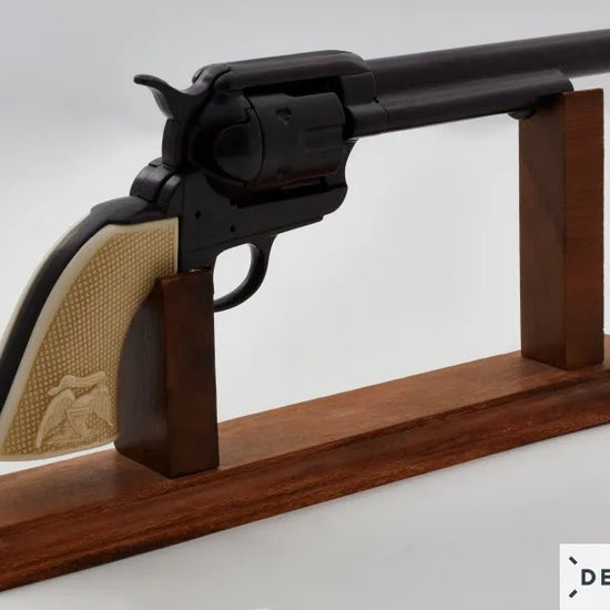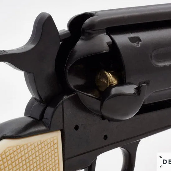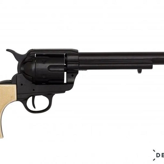 Revolver reproduction 7½" made of metal with plastic grips in ivory imitation, with simulated mechanism of charge and firing and rotating drum.