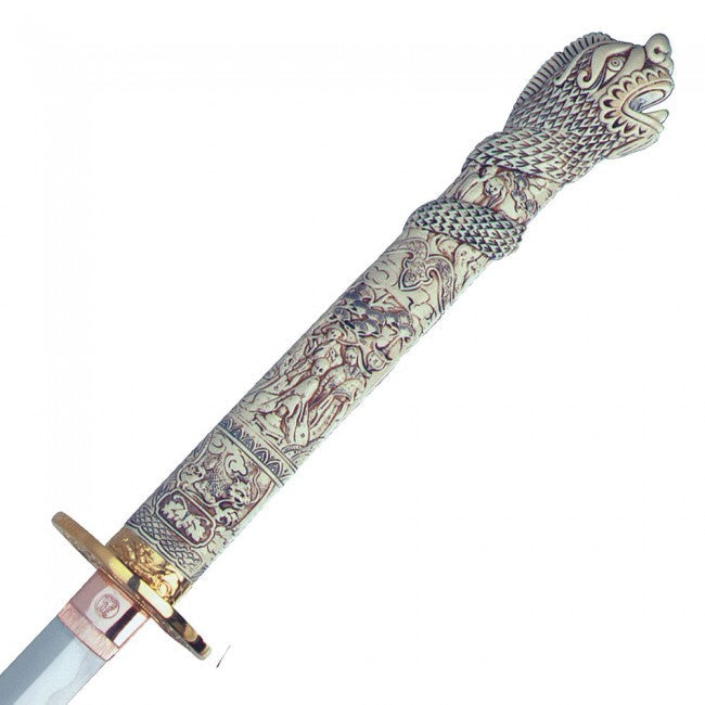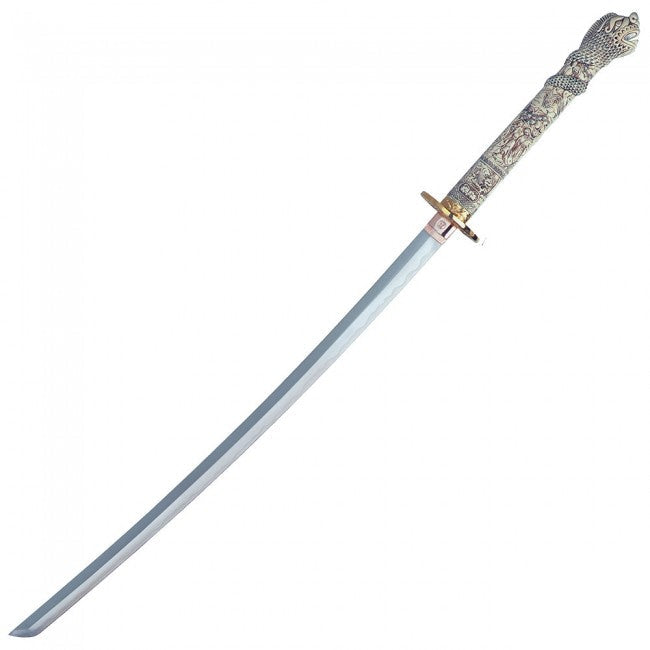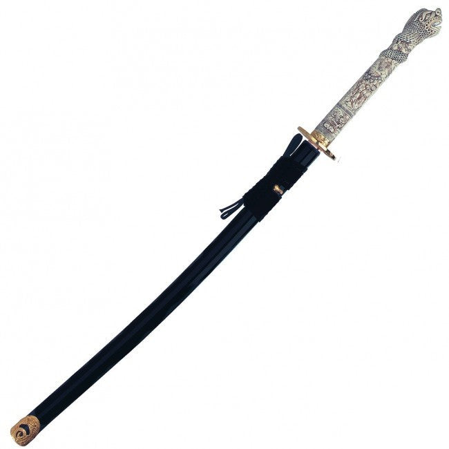 This item is now out of license but made to the same exact specifications as the original licensed product. It features an impressively detailed faux ivory dragon-head handle, 420 stainless steel blade and black lacquered scabbard.