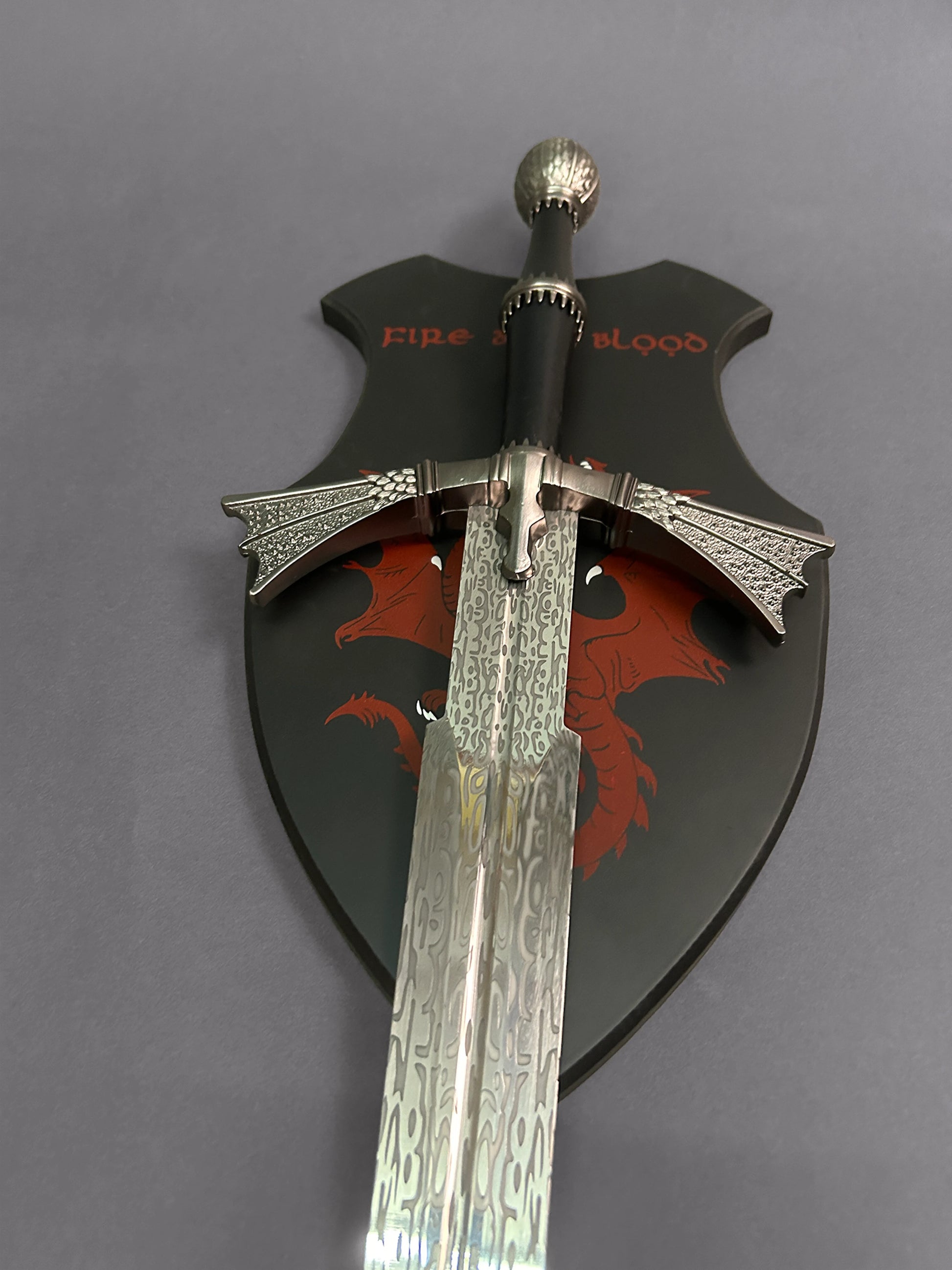 A great warrior, she used it in battle as well as riding her dragon, Vhagar, during Aegon’s conquest. Dark Sister is a comparatively thin and light blade, because it was the chosen weapon of a female warrior though as it is made of Valyrian Steel, it is still very strong and sharp.