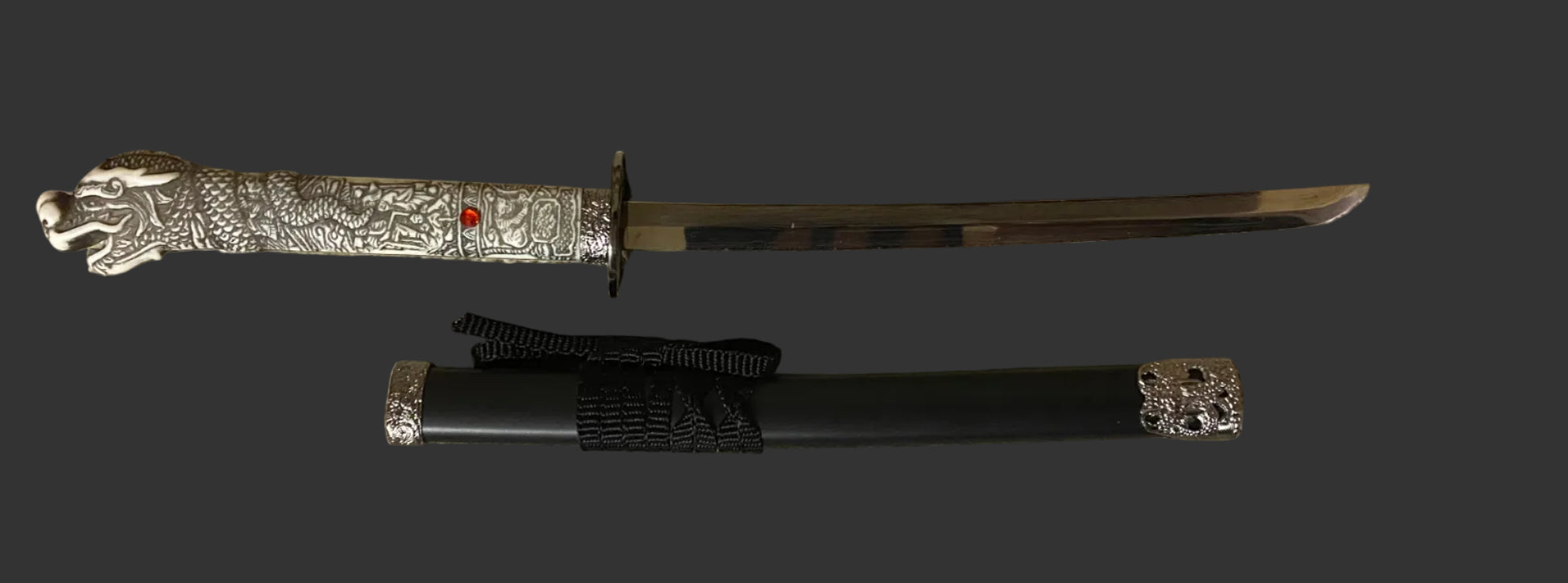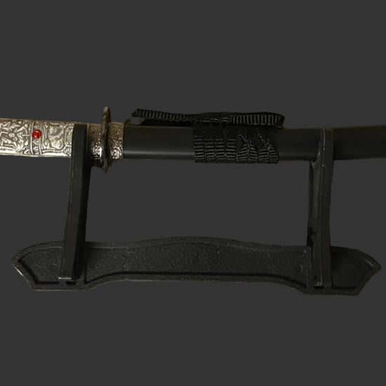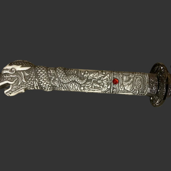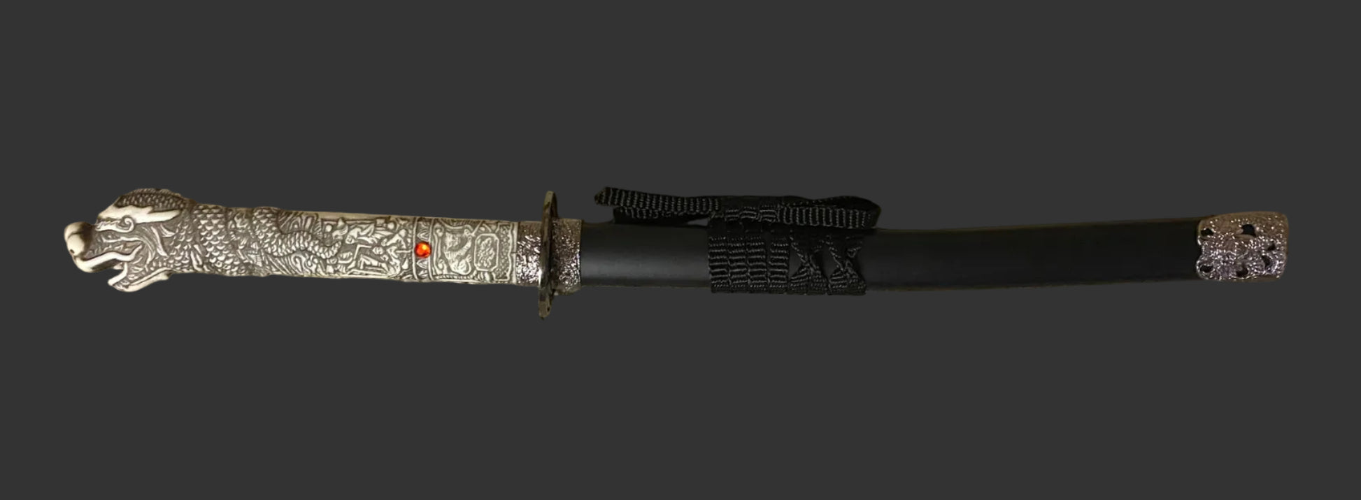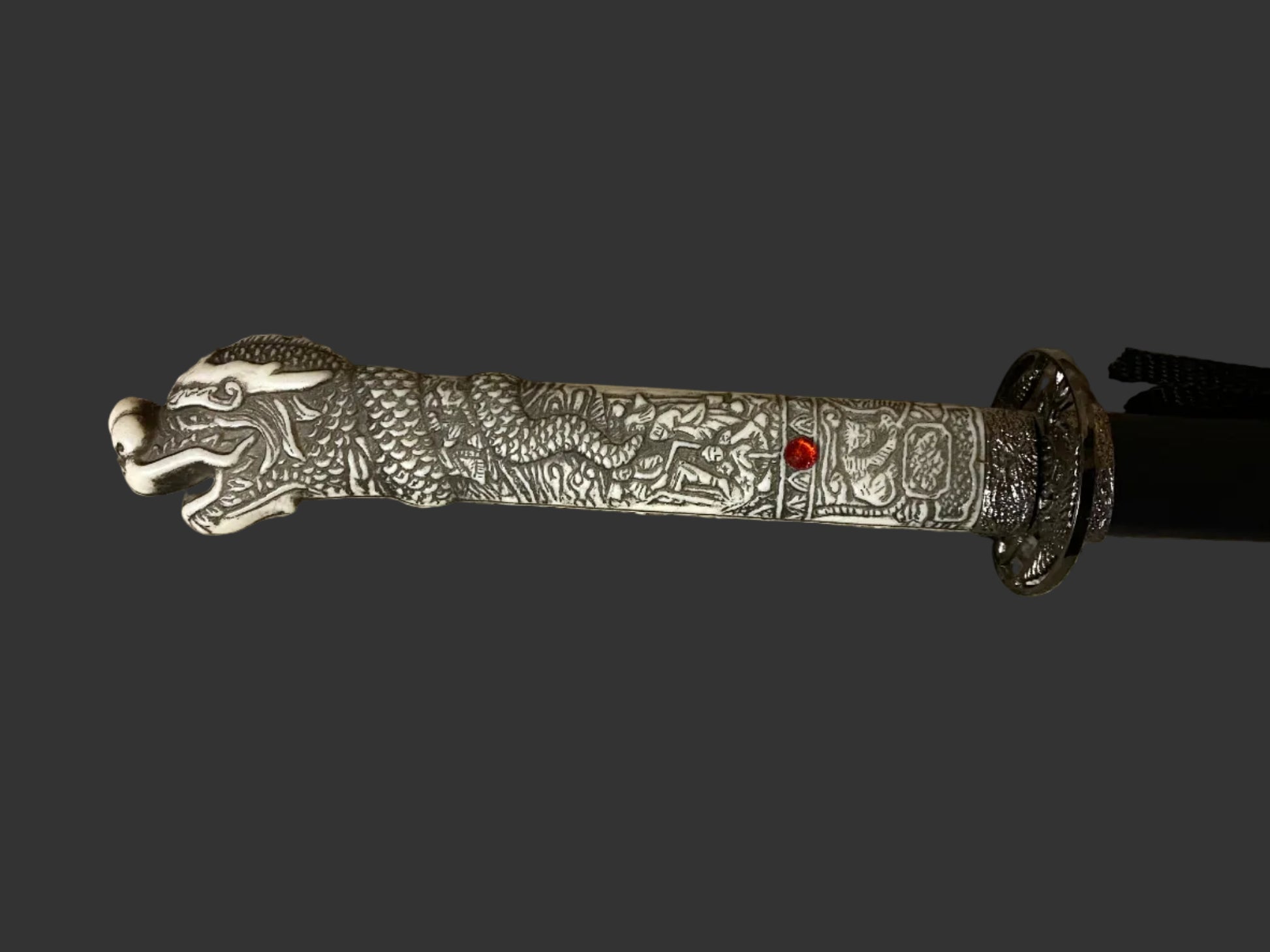The Hilt: A distinctive ivory (or faux-ivory) handle carved into the shape of a dragon’s head with a gaping mouth at the pommel. Allegedly folded over 200 times, creating a blade of "diamond-hard" strength and surgical sharpness.