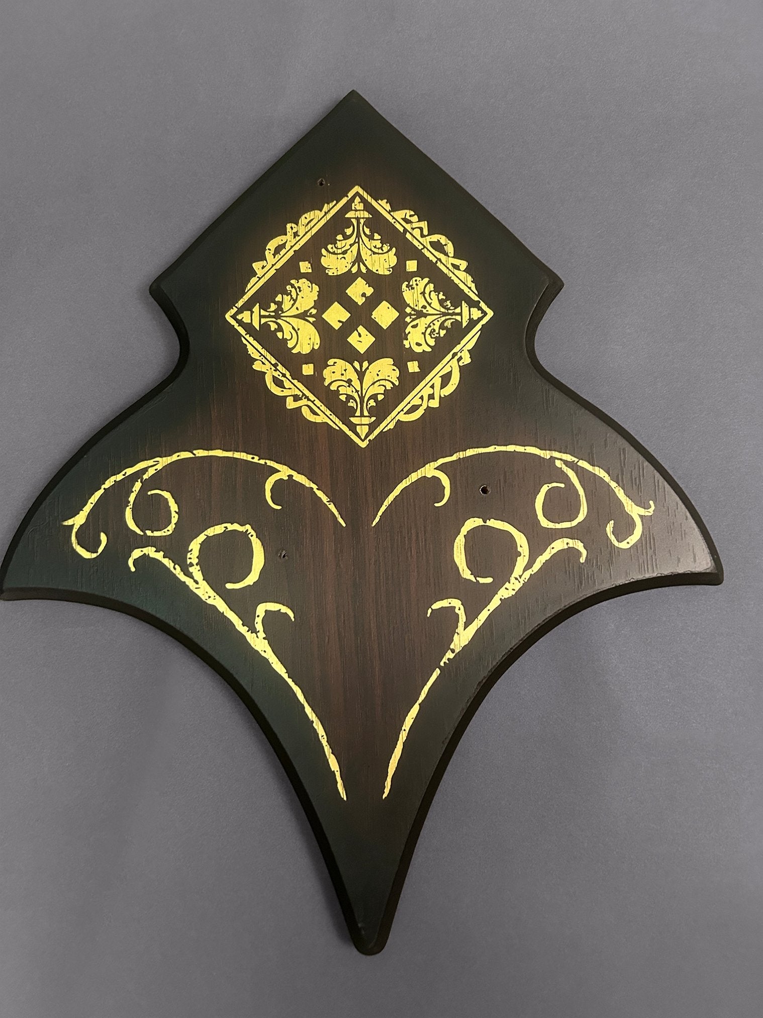 This Replica sword measures 100+/- cm in length. The stainless steel blade features a delicately etched leaf pattern located near the base of the hilt. The leaf pattern flows onto the hilt, which develops the look of a dragons tooth.