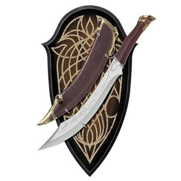 It proved to be a valuable asset to Strider as he journeyed into territories of evil, including the Battle of Helms Deep, and in his battle against Lurtz, the leader of Sauron's evil breed of Uruk-Hai. Strider carried this beautiful knife on his side in its genuine leather-wrapped sheath. Engraved on the blade are runes in the Elven language of Sindarin that say 'Gud Daedheloth.' This translates to 'Foe of Morgoth's realm'.