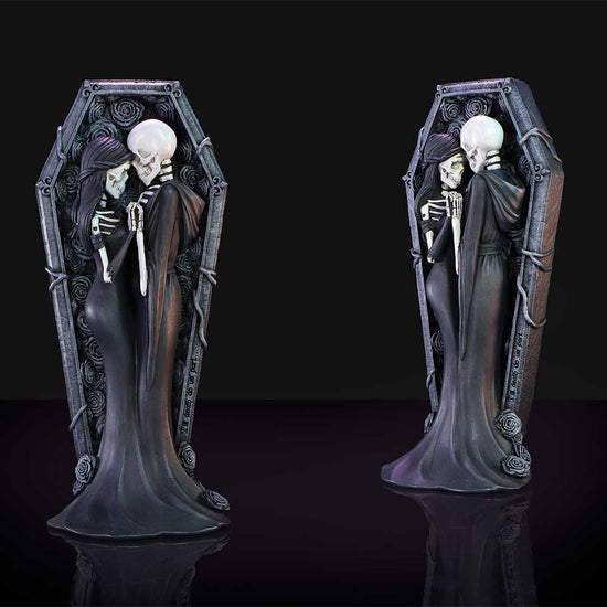 This Original Eternal Promise Figurine is a darkly romantic ornament featuring two skeletons lovingly embracing inside a coffin.