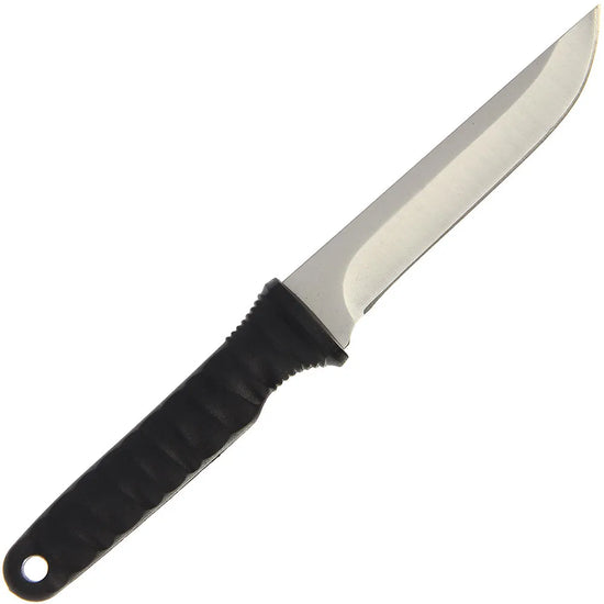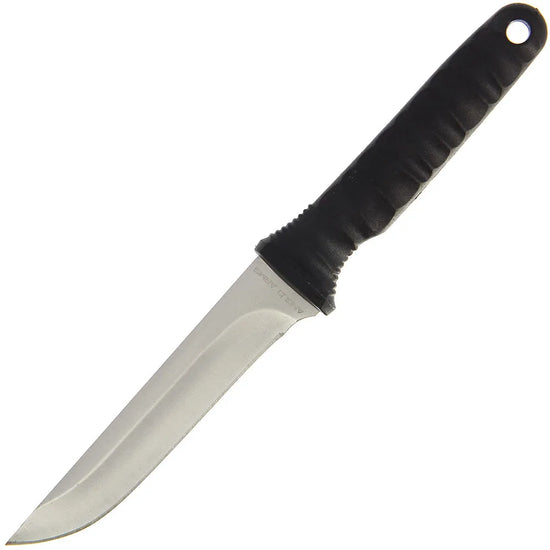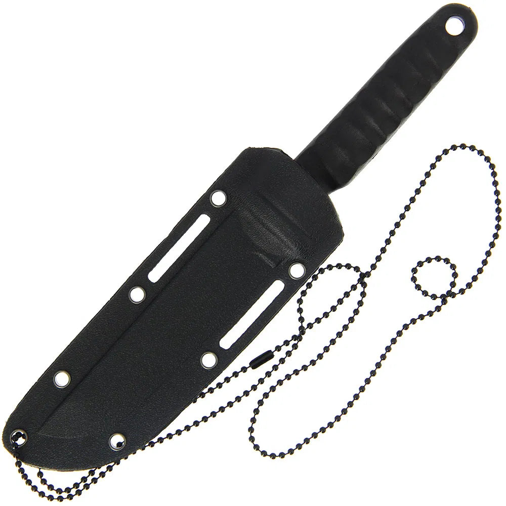 A 8" hidden tang (3mm) knife with a moulded plastic handle and ball chain.