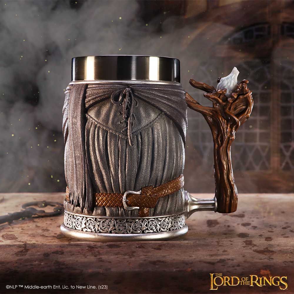 The tankard features a meticulously sculpted handle, shaped like Gandalf's™ mighty staff, complete with his flowing grey robes.