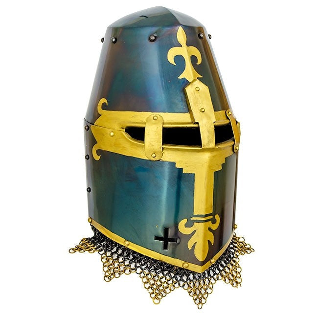 It is constructed from 18 gauge steel and features hand painted brass effect decoration like the original. It features a chainmail aventail to protect the neck. The Great Helm of Rieter van Kornburg is a fantastic display piece!