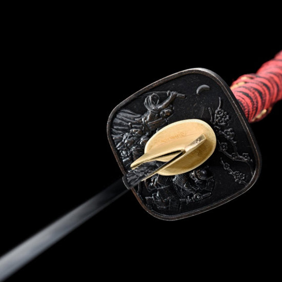 This hand forged katana is clay tempered. This involves smearing clay on the blade during heating and quenching to offer a uniform hardness to the blade and remove weak points which can occur when the heating or quenching is less even. It also allows the smith, by placing the clay thicker on certain parts of the blade, to make the edge harder (thus more able to keep the famous razor sharp samurai edge) and the rest of the blade less hard but more able to absorb impact.