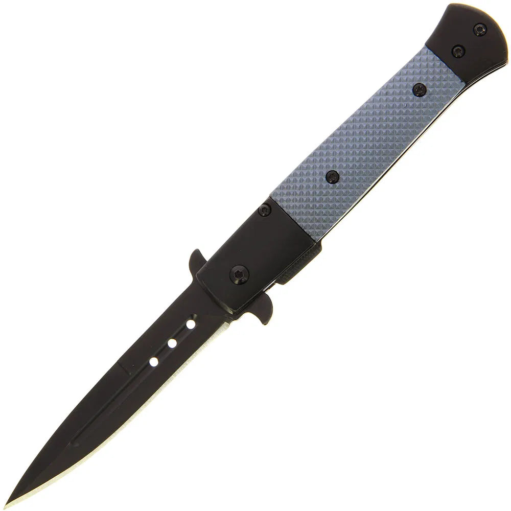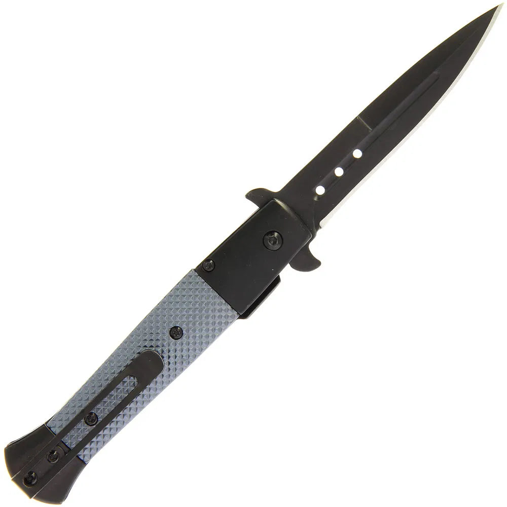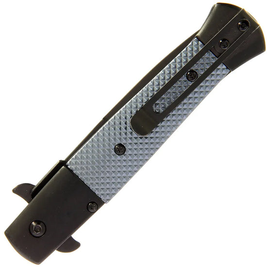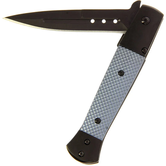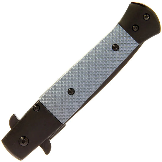 A black lock knife with a grey textured aluminium handle and stainless steel blade.