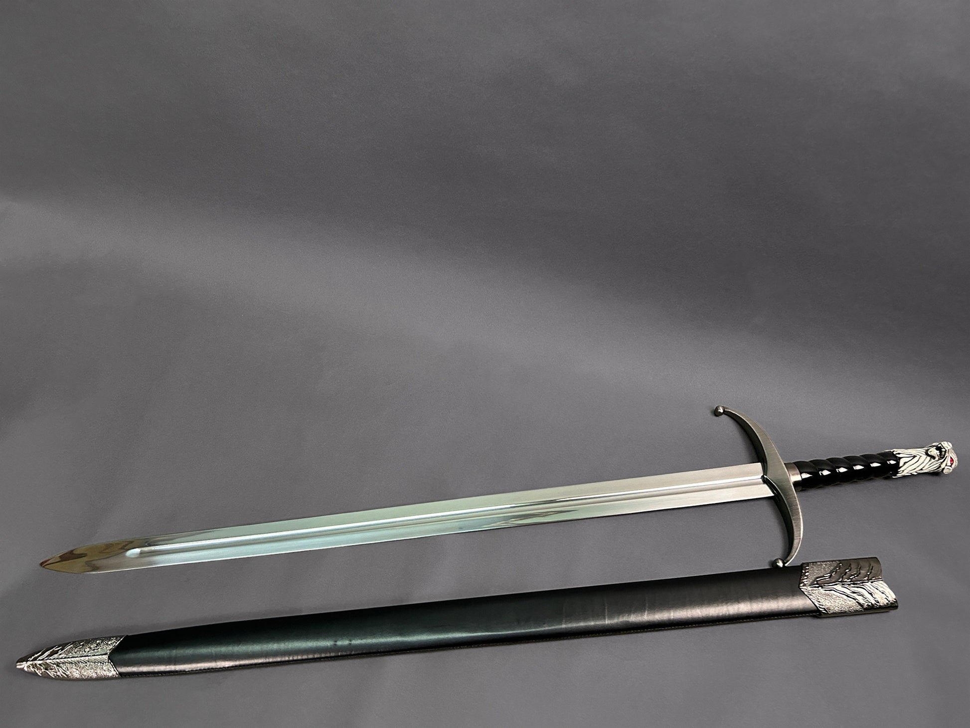 The Bastard's "Direwolf Sword" is 108cm with a stainless steel blade 83.5cm long. The handle is completed with an imitation ivory pommel. The plaque is wooden with the oath of the brotherhood on it.