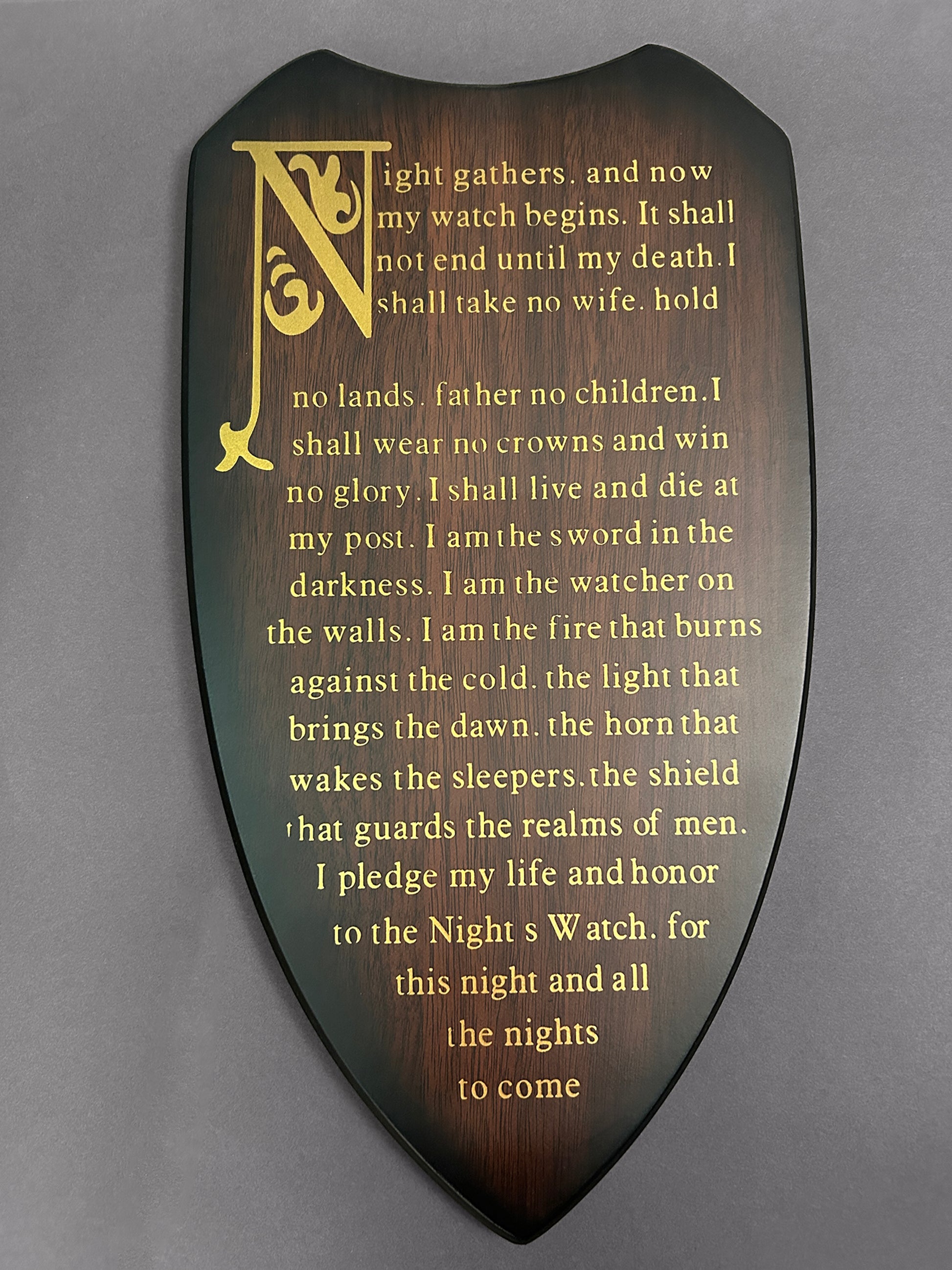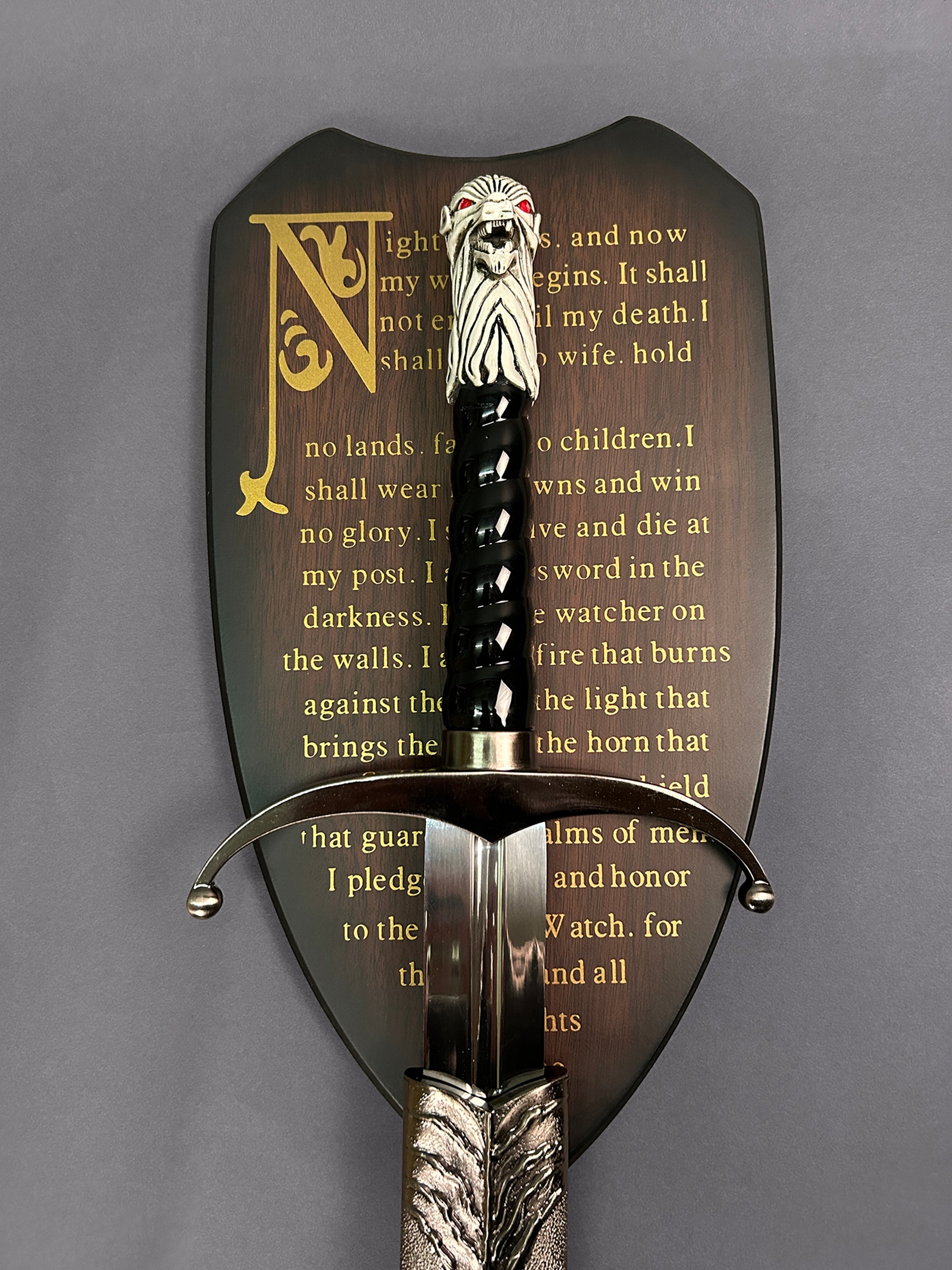 Supplied with Nights watch Oath display plaque and a scabbard.