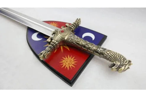 The sword features a solid metal handle and comes with an ornate wooden display plaque, perfect for showcasing this legendary weapon. Designed from 440 stainless steel, it embodies both durability and elegance.