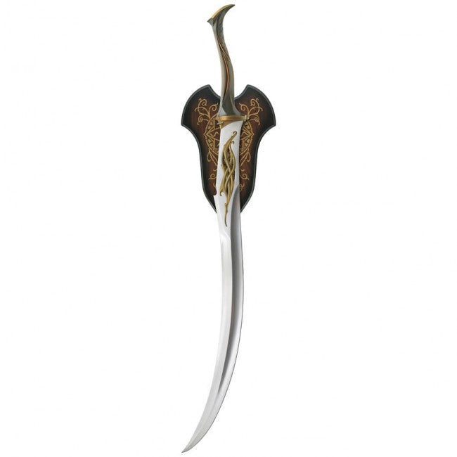 This United Cutlery collectable replica features bronze finished cast metal hilt parts, a composite grip, and stainless steel blade with cast metal ornaments. It is presented with a wooden wall display (mounting hardware and instructions included) featuring a Wood Elf graphic motif and includes a certificate of authenticity.