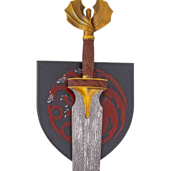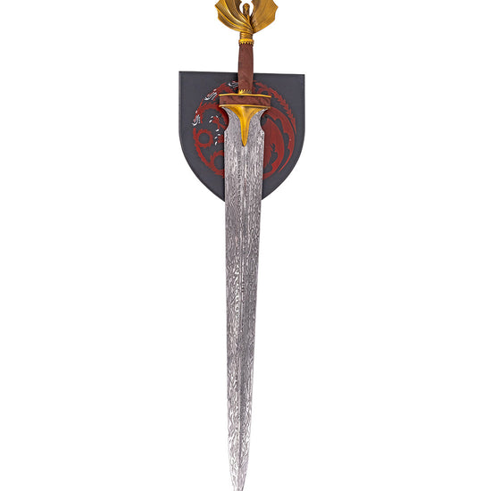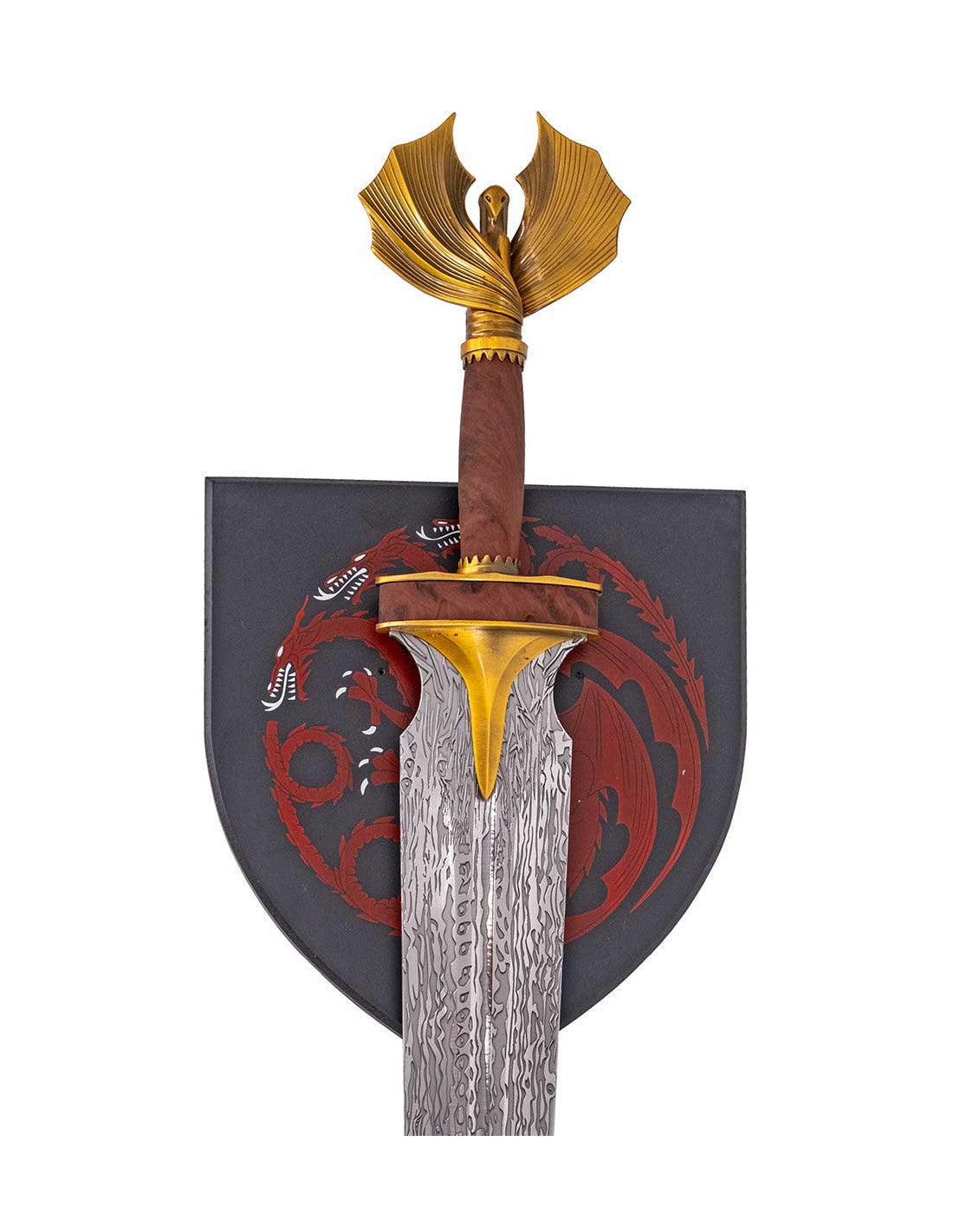Features a steel blade simulating the mythical Valyrian steel and an elegant brown finish on the guard and handle, topped with a pommel that evokes dragon wings.