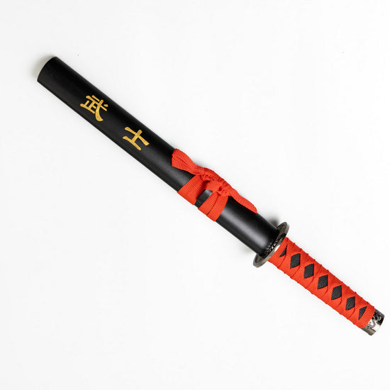 A Tanto sword with a Red webbed handle, black scabbard printed with 'SAMURAI' and decorative Red ribbon.