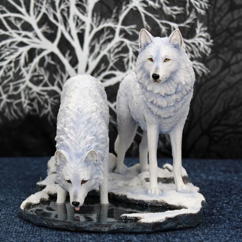 One stands vigilant, the other dips to drink from the pool, but both stare directly at you.