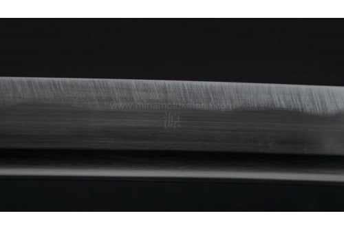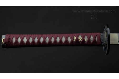 This hand forged katana is clay tempered. This involves smearing clay on the blade during heating and quenching to offer a uniform hardness to the blade and remove weak points which can occur when the heating or quenching is less even. It also allows the smith, by placing the clay thicker on certain parts of the blade, to make the edge harder (thus more able to keep the famous razor sharp samurai edge) and the rest of the blade less hard but more able to absorb impact.